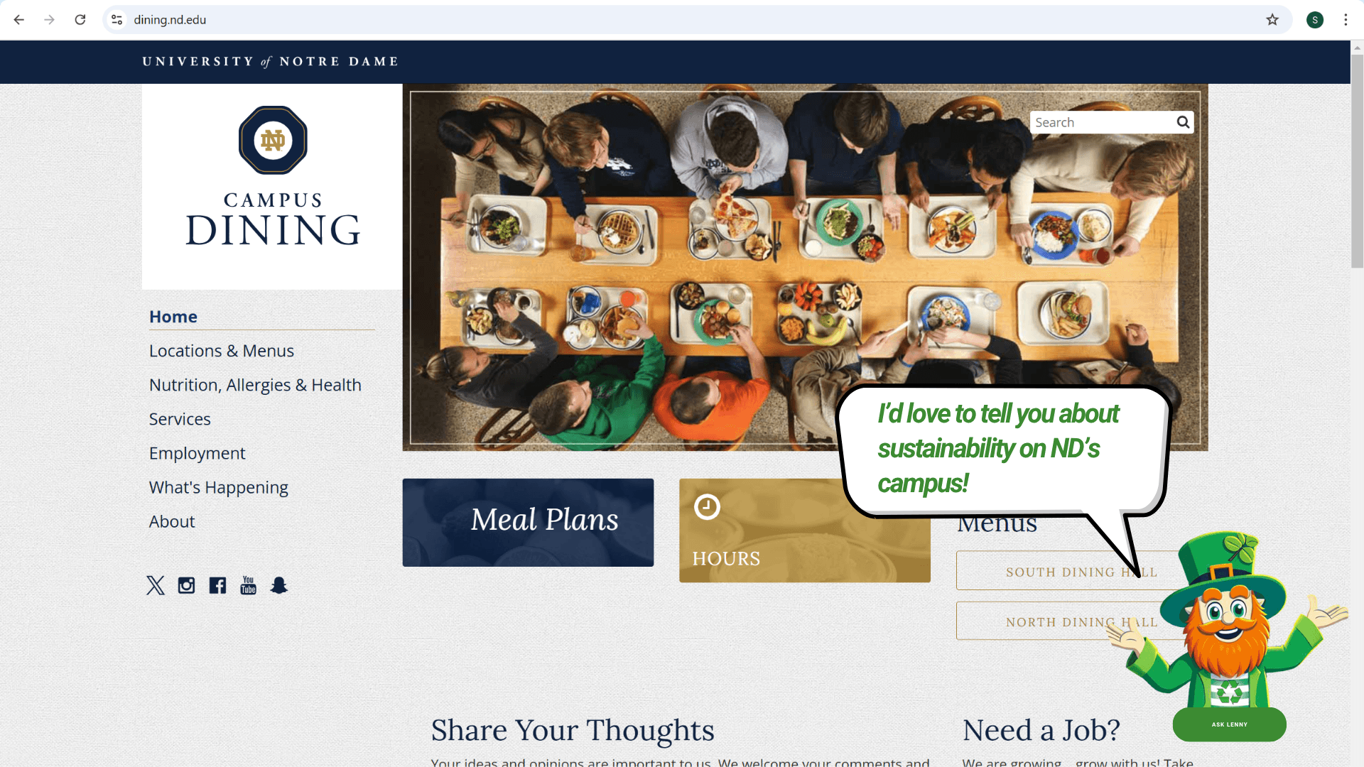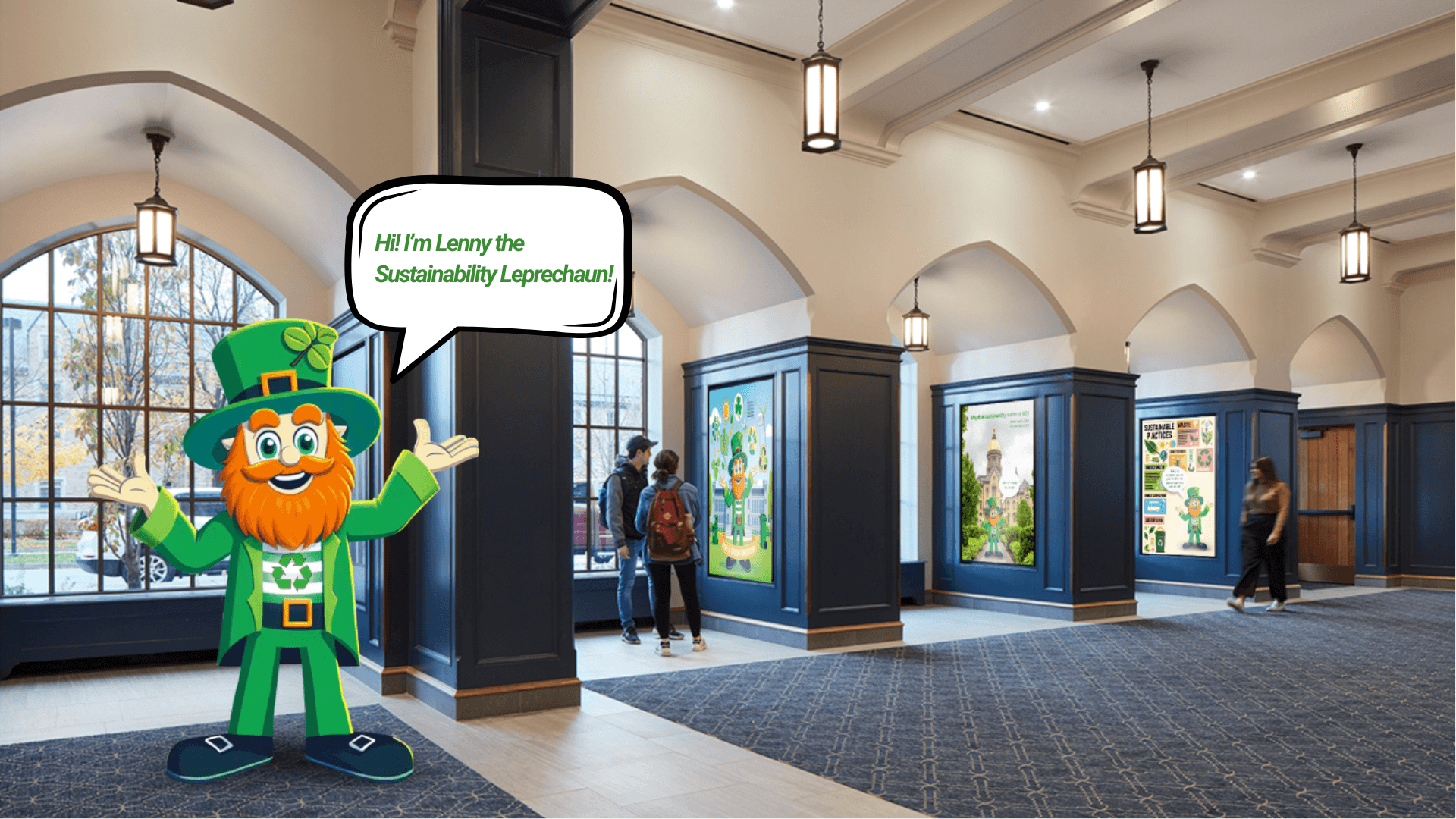 In Spring 2025, Notre Dame will introduce Lenny the Leprechaun. Lenny is intended to be the campus mascot for sustainability, and a way for students to connect with the issue. Lenny’s job is to educate students on University efforts towards sustainability, and make it fun along the way. During the Spring Semester, students can expect to see Lenny around campus and partnering with the Sustainability Office to hold events.