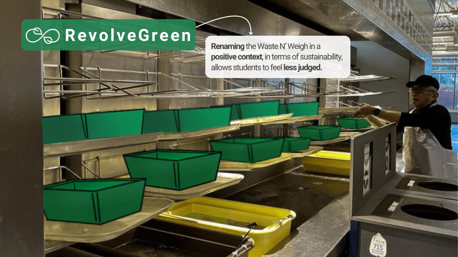RevolveGreen is a system similar to the Waste ‘N Weigh where students scrape their leftover food into buckets and sort their dishes accordingly. What makes RevolveGreen unique is that the buckets are rotating on the Food Disposal Carousel so that the normal flow of traffic is maintained and students don’t feel like they’re being put on display.